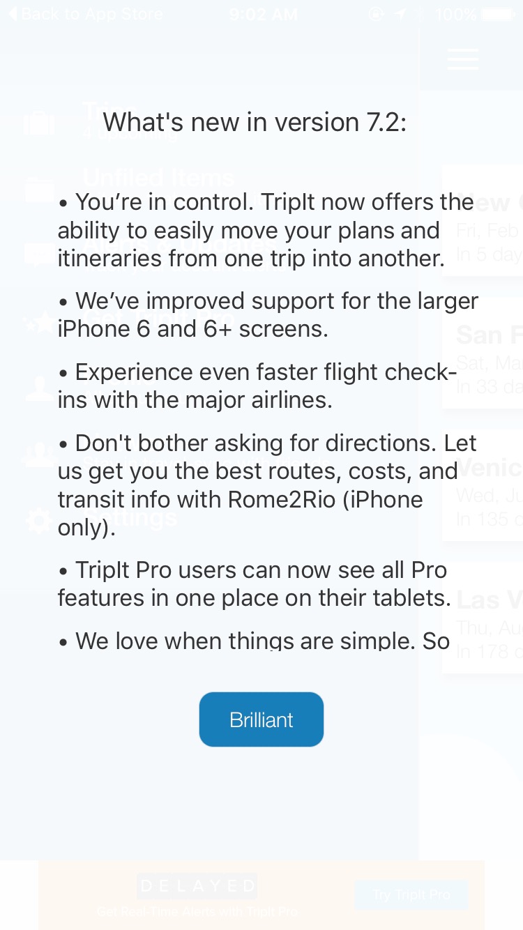 The travel-resource application TripIt has a nice use of the word in its upgrade protocol (seen in the screenshot below). Sometime in the mists of time, it was established that, in anything having to do with computers, you click the word “OK” to indicate comprehension or agreement or just “go to the next screen.” TripIt has come up with an alternative to “OK.” Brilliant.
