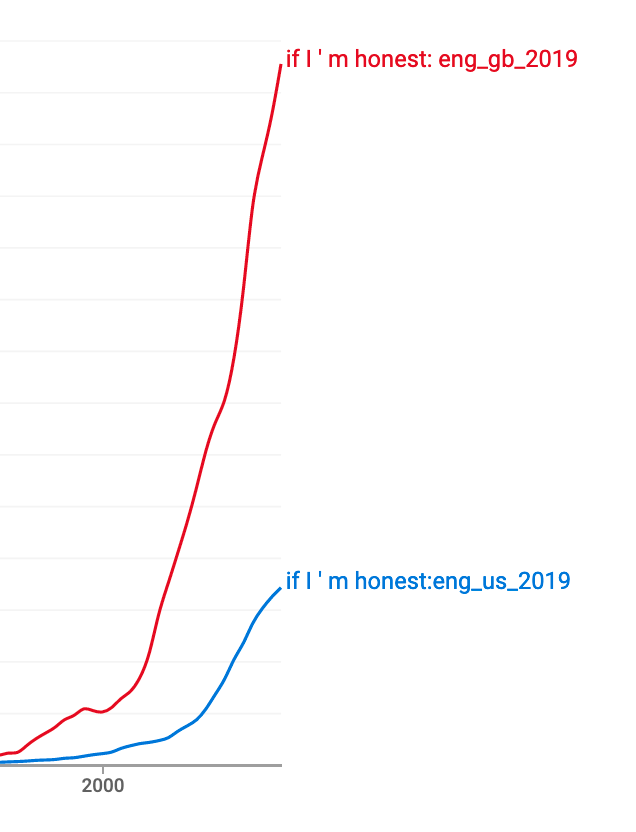 In a post on her blog, Separated by a Common Language, linguist Lynne Murphy did some investigating and found out that not only “If I’m honest,” but also the similar expressions “If I’m being honest” and “To be honest,” are used far more in the U.K. than the U.S. She goes on to muse: