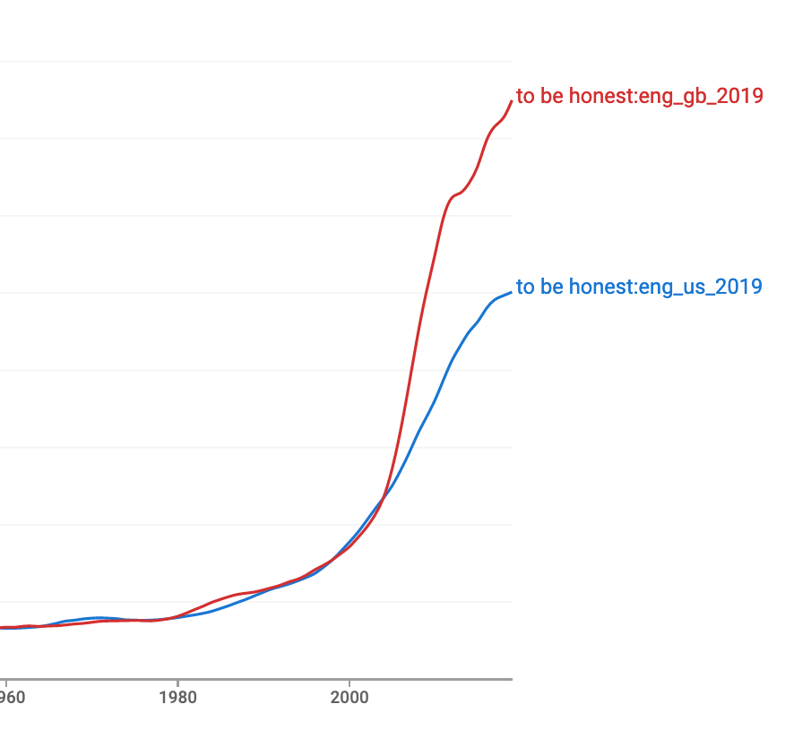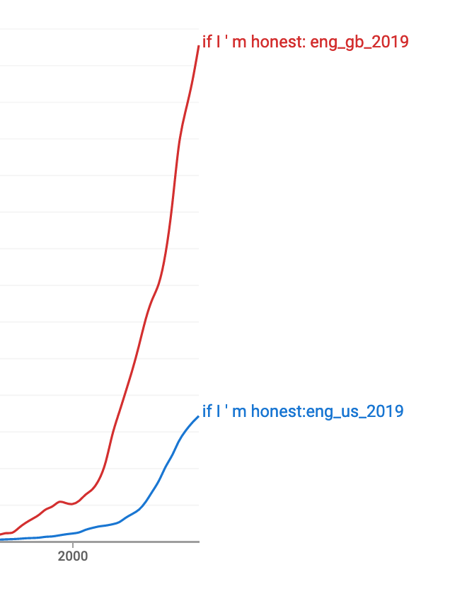 In a post on her blog, Separated by a Common Language, linguist Lynne Murphy did some investigating and found out that not only “If I’m honest,” but also the similar expressions “If I’m being honest” and “To be honest,” are used far more in the U.K. than the U.S. She goes on to muse:
