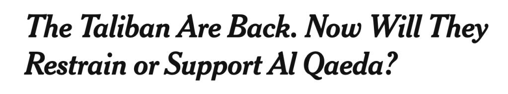 This is a (rare) timely post for the blog, and I wish it weren’t keyed to a somber occurrence, the Taliban’s taking control of Afghanistan. But it is, and that turn of events has been accompanied by headlines such as this.