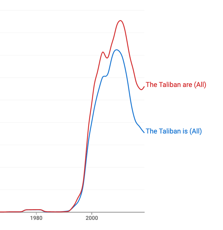 2. The point is that “taliban” isn’t a grammatically singular collective noun, but that it’s grammatically plural in Arabic. (Persian and Pashtu generally – there are exceptions – retain the Arabic plurals of borrowed Arabic words, though they don’t go so far as to borrow the dual forms). So this isn’t the British style; it’s the extra careful style that recognizes the singular/plural categorization of words according to the grammar of the words’ source languages. Thus saying “the taliban are” is analogous to saying “the data show . . .” or “the phenomena are . . .”