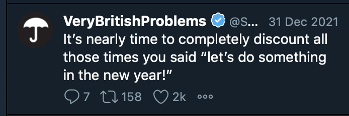 Back in 2019, I noted that while Americans use the expressions “ring in the new year” or “bring in the new year,” they’re not like to use stand-alone “in the new year” as much as the British do. I was reminded of it by a tweet from @verybritishproblems: