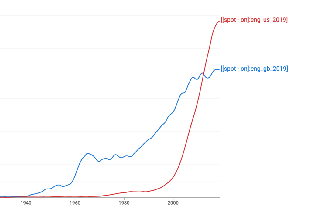 In other words, as of 2012 or 2013, U.S. use topped British use. Supporting what I said at the top: in some situations, “spot-on” is, well, spot-on.