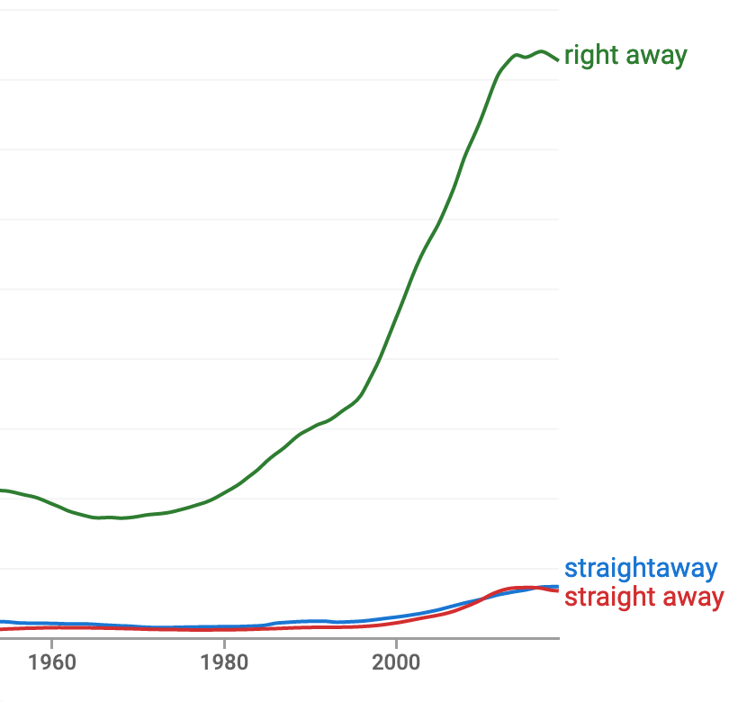 But first I’ll point out that the American equivalent is “right away” (always two words) or “immediately.” Here’s an Ngram Viewer chart showing frequency in American books: