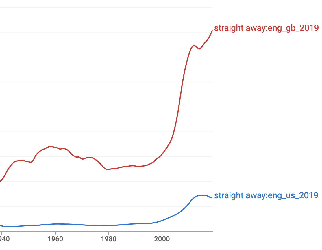 But first I’ll point out that the American equivalent is “right away” (always two words) or “immediately.” Here’s an Ngram Viewer chart showing frequency in American books: