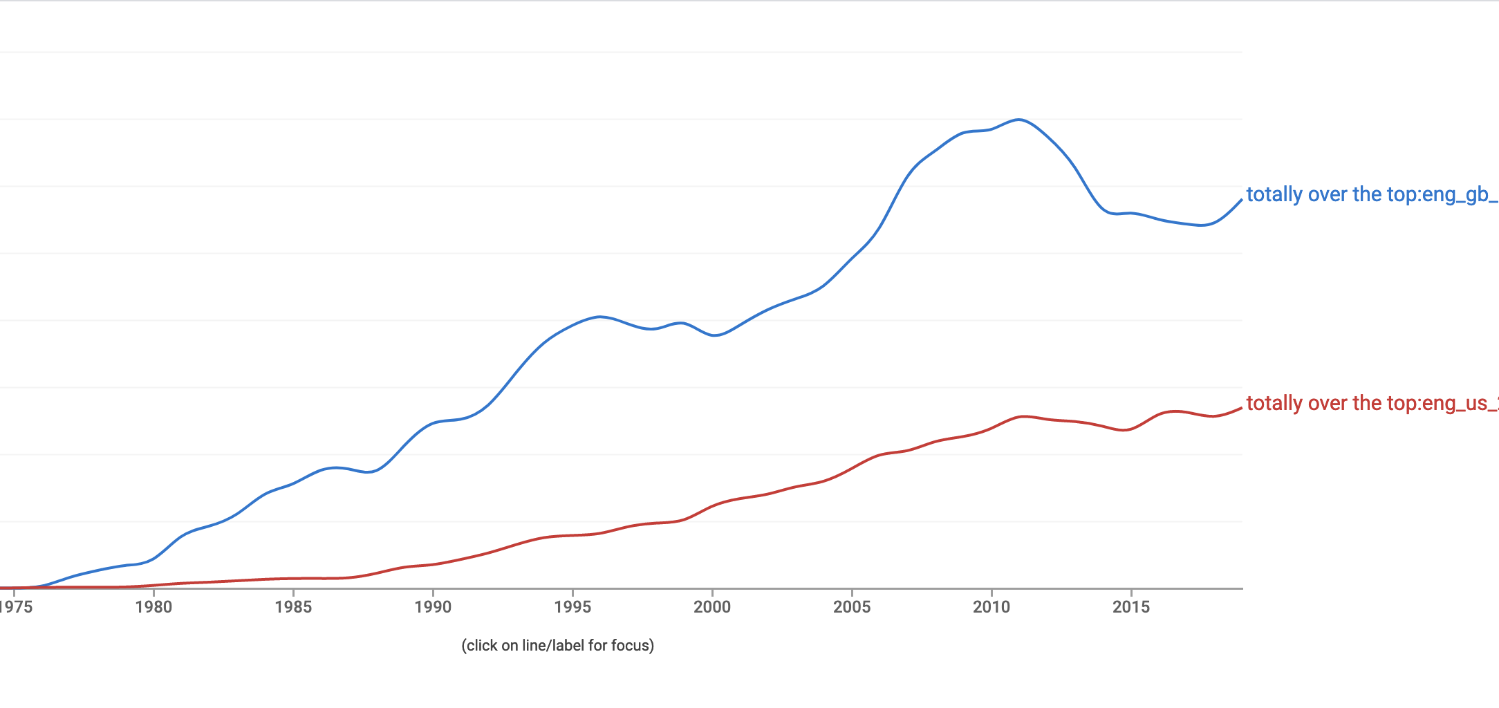 It’s difficult to use Ngram Viewer and the other databases I normally consult to track the progress of this phrase and its relative frequency of use in Britain and the U.S. That’s because searches for “over the top” yield a great deal of noise: references to climbing over the top of a hill, sprinkling sugar over the top of a cake, and so on. Lynne Murphy suggested slipping an intensifier before the phrase; taking a cue from the Sloane Rangers and searching for “totally over the top” in Ngram Viewer worked nicely: