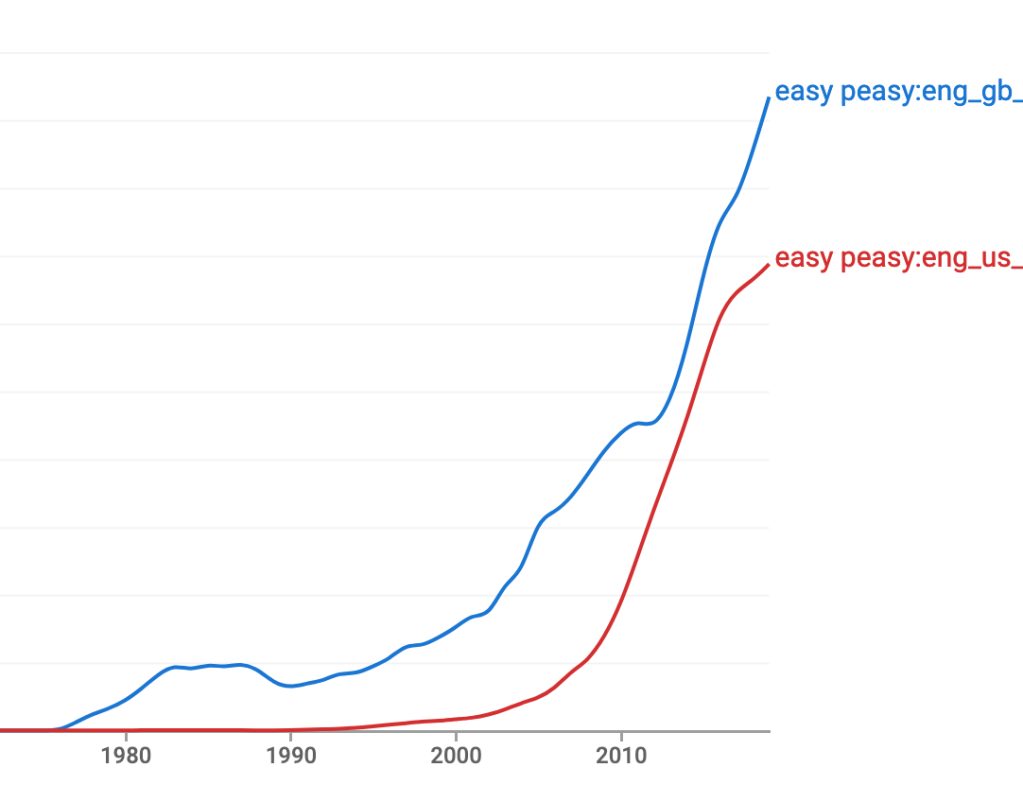 But I’m sceptical about ‘the rhyme coming easily to the tongue’ suggestion – hundreds of rhymes do (witness rhyming slang) – so why should ‘easy peasy’ pop in and out of existence in the US, where there is no strong rhyming tradition?