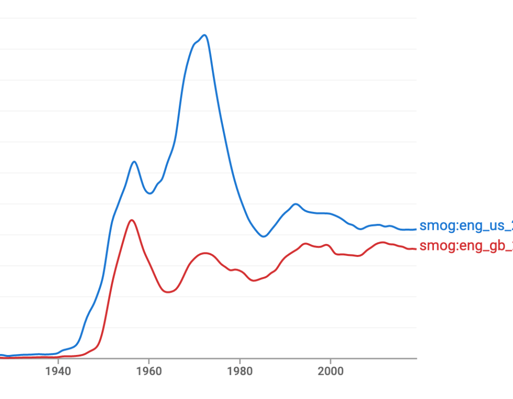 Things soon changed as American cities (notably Pittsburgh and Los Angeles) developed the problem, and Americans adopted the word. Indeed, Ngram Viewer shows that since the early ’20s, U.S. use of “smog” has surpassed that in Britain — most dramatically during the environmental movement of the 1960s and early ’70s. That is, right when Joni Mitchell was writing “Woodstock.”