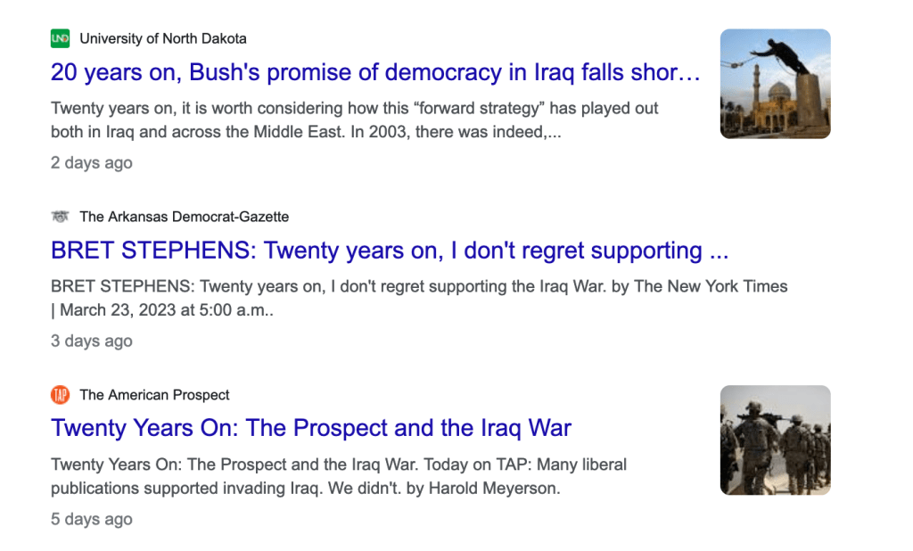 We’ve just experienced the twentieth anniversary of of the U.S. invasion of Iraq and my sense is that “years on” is even more popular in discussions of it. Thus, from Google News, and then the New York Times: