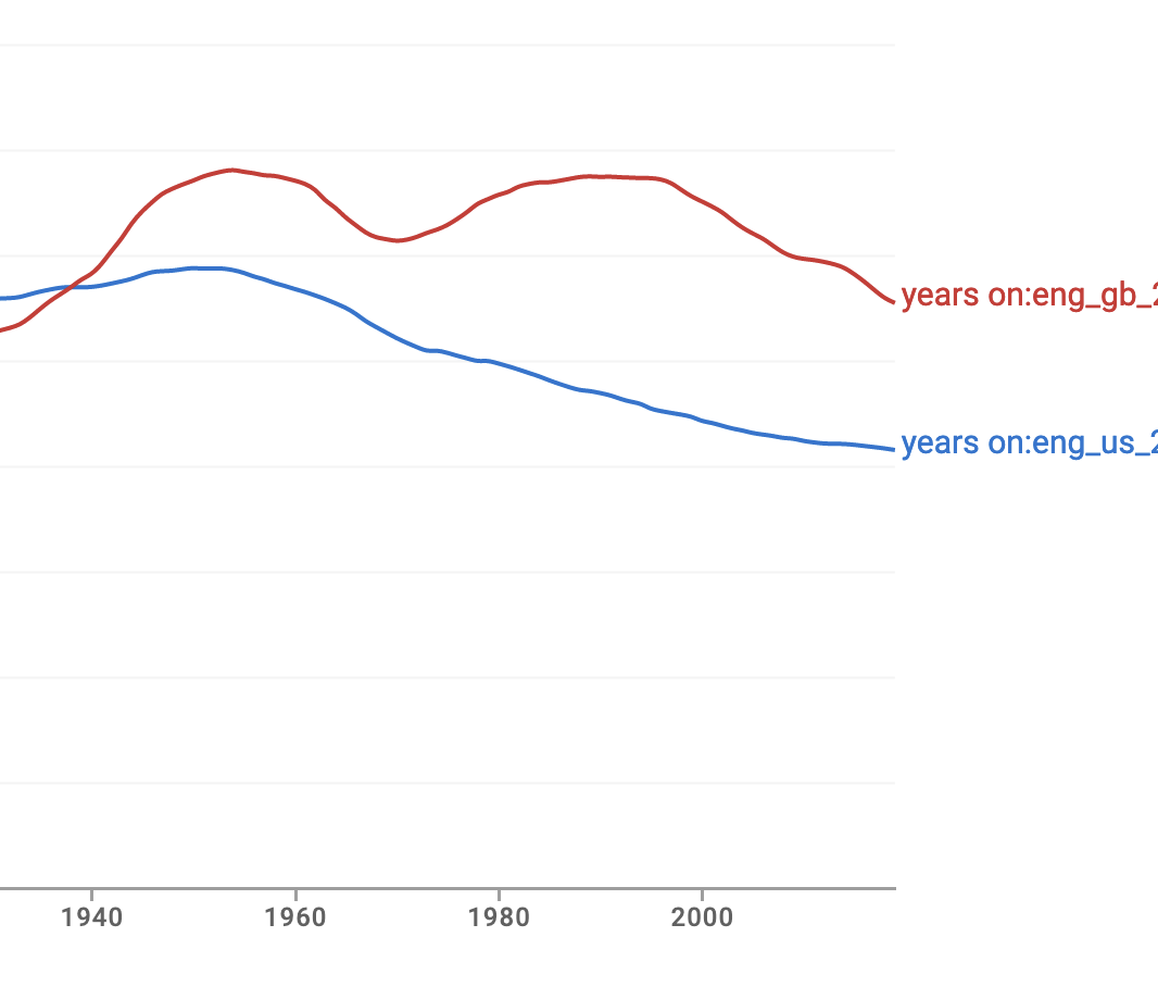 Here’s the Ngram Viewer graph for American and British use of “years on”:
