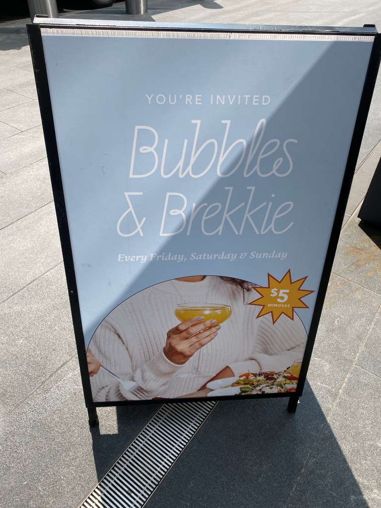 So, not only “bubbles” but also “brekkie” and “mate“: a veritable NOOBs-orama! My enthusiasm was dampened a little bit when I found out that the advertised enterprise, Bluestone Lane, was founded by a former Australian Rules Football player named Nick Stone and describes itself as “bringing Aussie café culture (and better coffee) to the USA.” Clearly, the signage is leaning in to the Aussie identity.