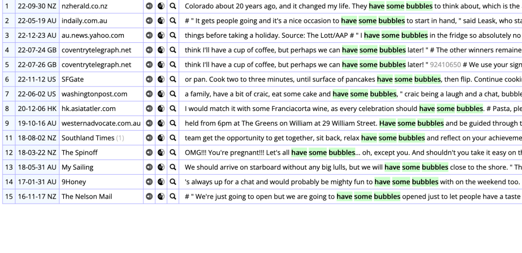 Update: After getting some blowback in the comments along the lines of “I’ve been British all my life and I’ve never heard of such a thing,” I decided to investigate further by searching for “have some bubbles” in a few recent corpora. News on the Web (NOW), which tracks usage from 2010 to the present and has some 17.5 billion words of data, had thirteen hits. (There are fifteen in the graphic below, but numbers 4 and 5 are the same, and 13 refers to the bubbles in pancakes.)