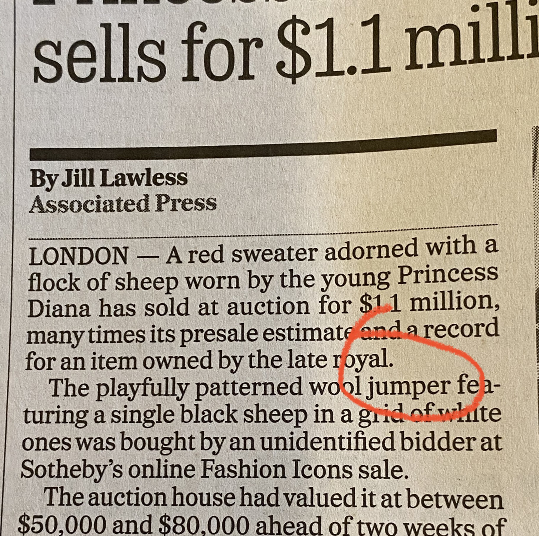 - The article is datelined “London” and is about stuff that happened in England; Princess Diana herself would probably have called the garment a jumper. So using the word in the article has a certain logic to it.