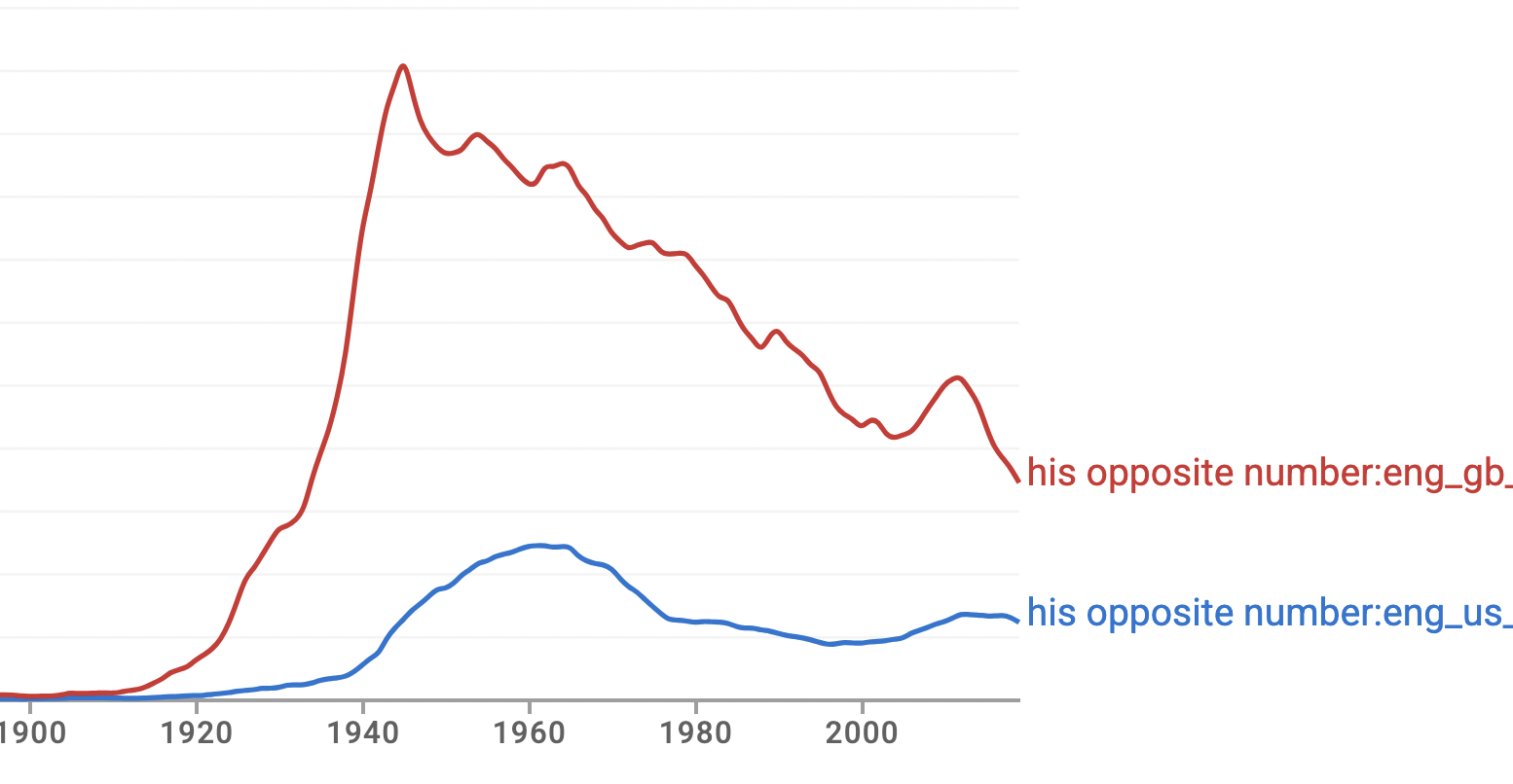 Which suggests to me that “opposite number” currently lives most robustly as a British sportswriting cliché. Or at the very least as elegant variation for “counterpart.”