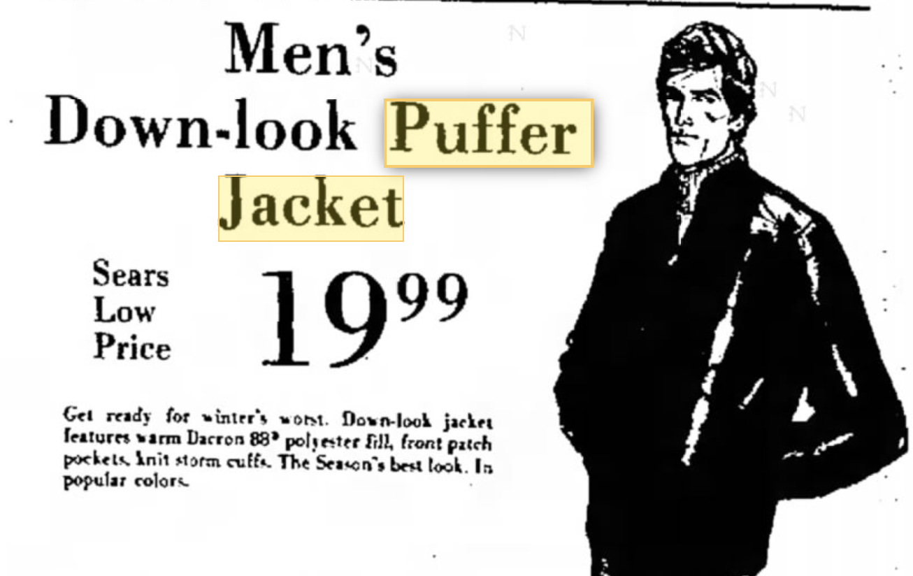 Here’s the first interesting quirk. I would imagine Rogers chose the company’s name in recognition of the British non-rhotic pronunciation of the word “puffer”–and hence that there was already such a thing as a “puffer” or “puffer jacket.” But that does not seem to be the case. The first references I’ve been able to find to a “puffer jacket” comes from a series of advertisements in 1976-’81 from the American retailer Sears, which offered such a garment and apparently invented a name for it.