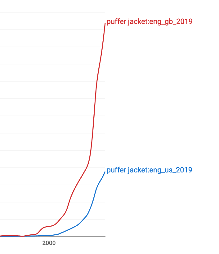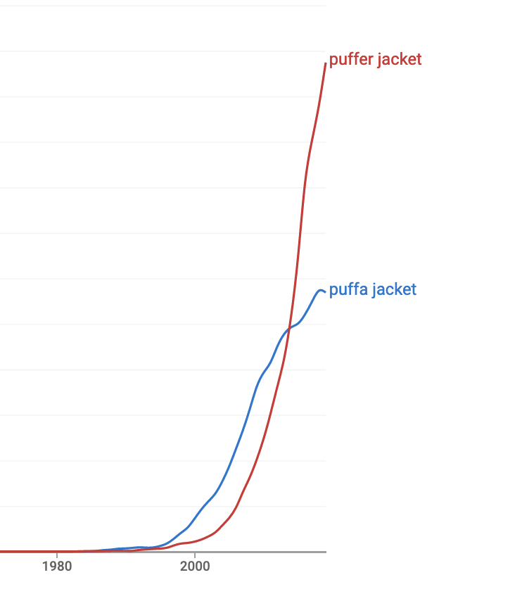 Now, as to the issue of NOOB-ness, both “puffa” and “puffer” qualify, though the former pretty much only appears in reference to the brand. Ngram Viewer shows “puffer jacket” rising steadily here since about 2000, though it’s still far outstripped by British use.