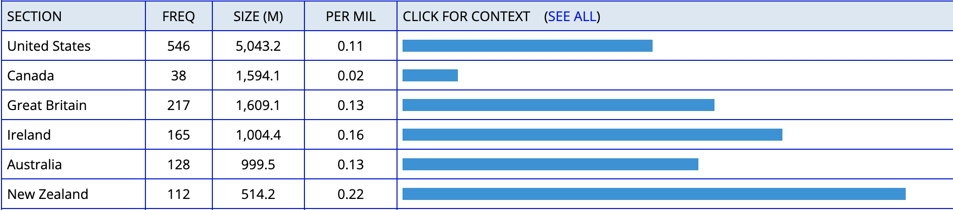One final point. It’s significant that Key is from New Zealand because the term appears to be really popular there. Here’s the geographical breakdown of “puffer jacket” from the News on the Web (NOW) corpus, which charts websites since 2010:
